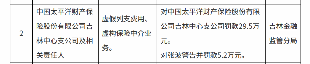 鉴于上述严重违反行业规范与法律法规的行径,吉林金融监管分局作出如下处罚决定:对中国太平洋财产保险股份有限公司吉林中心支公司处以人民币29.5万元的罚款;对相关责任人张波予以警告处分,并处以人民币5.2万元的罚款。