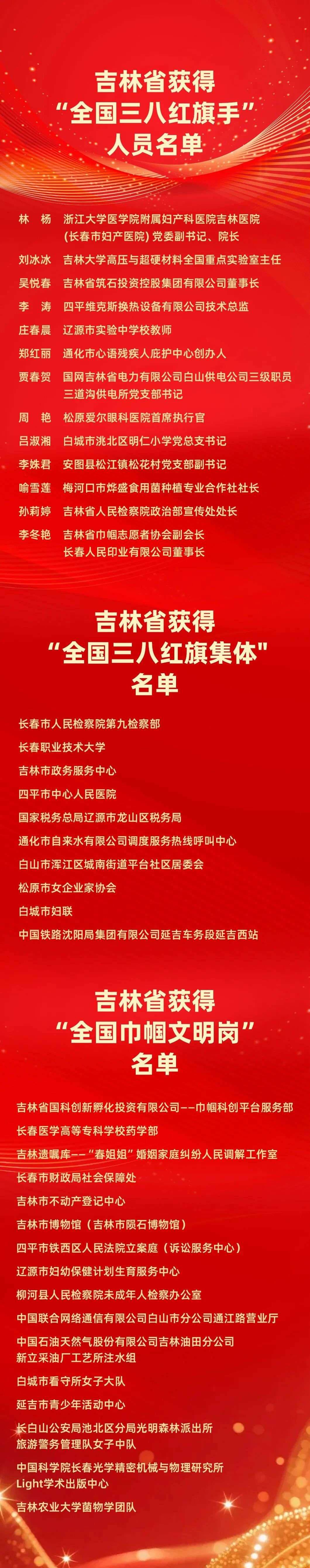 央广网长春3月3日消息(记者张学龙)3月2日,全国妇联在京举行纪念“三八”国际妇女节暨表彰大会,并公布2025年度全国三八红旗手标兵、全国三八红旗手、全国三八红旗集体及全国巾帼文明岗名单。其中,吉林省13人获评“全国三八红旗手”,10个集体获评“全国三八红旗集体”,16个集体获评“全国巾帼文明岗名单”。长春职业技术大学凭借在职业教育领域的突出贡献与巾帼团队的卓越风采,获评“全国三八红旗集体”称号。