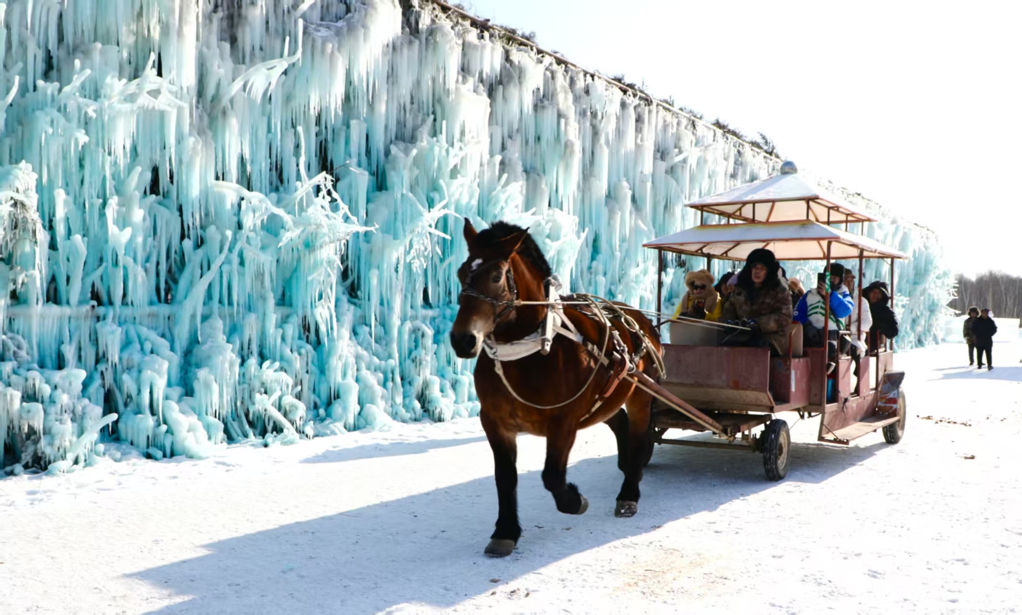 今年的冰雪狂欢季聚焦创新体验,推出林海冰凌谷、爱心玫瑰、雪人谷、关东文化、UTV四驱越野车五大核心项目。来自畅景国旅的文旅达人和游客乘马车探访林海冰凌谷,晶莹冰挂如水晶珠帘悬挂枝头,在阳光下熠熠生辉,宛如自然艺术杰作。舞蹈《冬捕庆丰年》以关东风情演绎丰收喜悦,游客驻足拍照,沉浸于北国雪乡的独特魅力。